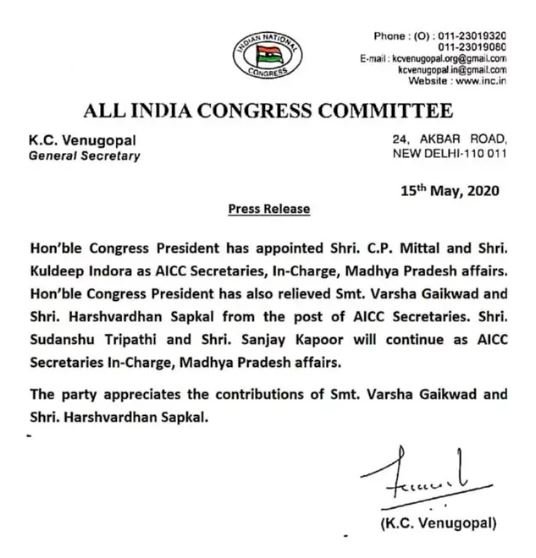 दरअसल, कांग्रेस ने महाराष्ट्र के नेता हर्षवर्धन सपकाल और वर्षा गायकवाड़ को हटाकर दिल्ली के सीपी मित्तल व राजस्थान के कुलदीप इंदौरिया को एआईसीसी ने प्रभारी सचिव बनाकर भेजा है। कांग्रेस महासचिव के सी वेणुगोपाल ने शुक्रवार को यहां जारी एक विज्ञप्ति में यह जानकारी देते हुए बताया कि पार्टी ने मित्तल तथा इंदोरा की नियुक्ति के साथ ही मध्य प्रदेश के प्रभारी सचिवों की संख्या चार हो गयी है। खास करके उत्तरप्रदेश के कांग्रेस नेता संजय कपूर व सुधांशु त्रिपाठी की जिम्मेदारी यथावत रखी गई हैं लेकिन महाराष्ट्र के हर्षवर्धन सपकाल और वर्षा गायकवाड़ को एआईसीसी सचिव पद से ही मुक्त कर दिया है।