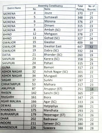 MP उपचुनाव रिजल्ट 2020 : जानिये किस सीट पर कितने राउंड में होगी काउंटिंग