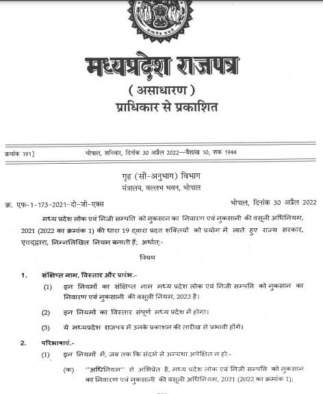 भोपाल। मध्यप्रदेश में संपत्ति नुकसान वसूली कानूनलागू हो गया है। दरअसल अब किसी भी दंगे-फसाद हड़ताल और धरना प्रदर्शन में निजी और सरकारी संपत्ति को नुकसान पहुंचाने पर उसकी भरपाई दंगेबाजे को करनी होगी। राज्य सरकार द्वारा कानून की अधिसूचना जारी की गई थी। जिसे अब गजट नोटिफिकेशन में लाया गया है। सांप्रदायिक दंगे-हड़ताल धरना प्रदर्शन और जुलूस के दौरान पत्थरबाजी करने पर निजी संपत्ति है। सरकारी संपत्ति को क्षति पहुंचती है तो जिस ने नुकसान पहुंचाया है। उसके खिलाफ तुरंत एक्शन लिया जाएगा।