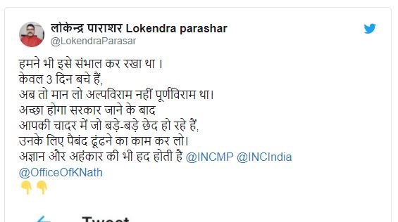 मध्य प्रदेश भाजपा के प्रवक्ता लोकेंद्र पाराशर ने कांग्रेस के ट्वीट के स्क्रीनशॉट ट्वीट करते हुए लिखा है कि हमने भी इसे संभाल कर रखा था। केवल 3 दिन बचे हैं, अब तो मान लो अल्पविराम नहीं पूर्ण विराम था। अच्छा होगा सरकार जाने के बाद आपकी चादर में जो बड़े-बड़े छेद हो रहे हैं, उनके लिए पैबंद ढूंढने का काम कर लो। अज्ञान और अहंकार की भी हद होती है