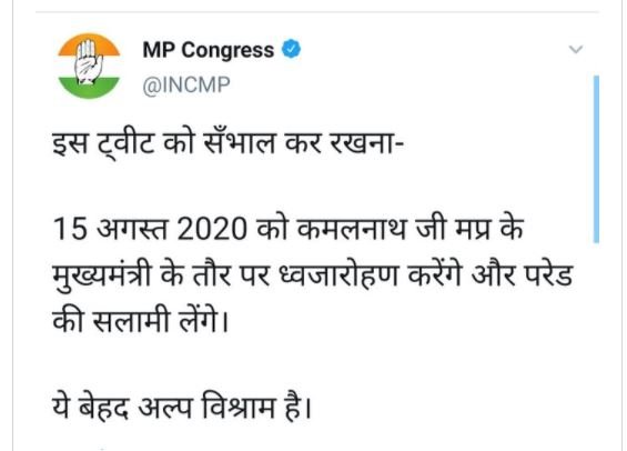 दरअसल, 20 मार्च 2020 को तत्कालीन मुख्यमंत्री कमलनाथ ने अपने पद से इस्तीफा दे दिया था| इसी दिन मध्य प्रदेश कांग्रेस के ऑफिशिल टि्वटर हैंडल से एक ट्वीट किया गया जिसमें लिखा था कि इस ट्वीट को संभाल कर रखना-15 अगस्त 2020 को कमलनाथ जी मध्य प्रदेश के मुख्यमंत्री के तौर पर ध्वजारोहण करेंगे और परेड की सलामी लेंगे, ये बेहद अल्प विश्राम है| अब जबकि 15 अगस्त 2020 तारिख आ गई है| लिहाजा कांग्रेस के ट्वीट को लेकर जमकर कटाक्ष किए जा रहे हैं| एक तरफ सोशल मीडिया पर कमलनाथ ट्रोल हो रहे हैं | वहीं भाजपा नेता भी कांग्रेस पर निशाना साध रहे हैं|