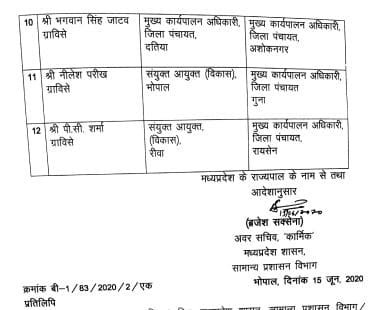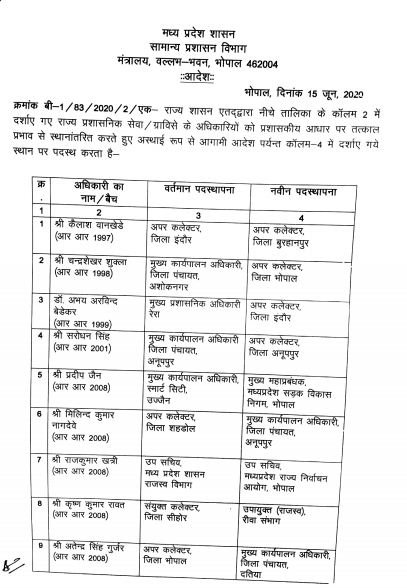 भोपाल| मध्य प्रदेश (Madhya Pradesh) में तबादलों का दौर जारी है| राज्य शासन ने एक बार फिर प्रशासनिक सर्जरी की है| राज्य प्रशासनिक सेवा और ग्रामीण विकास सेवा के अधिकारियों के तबादले (Transfer) किये गए