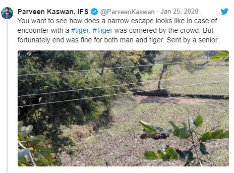 उन्होंने वीडियो शेयर करते हुए कैप्शन में लिखा, ”आप यह देखना चाहेंगे कि कैसे एक शख्स मौत के मुंह से बाहर निकला. बाघ शिकार कर सकता था. बाघ ज्यादा भीड़ होने के कारण डरा हुआ था. शुक्र है कि बाघ और शख्स दोनों को कुछ नहीं हुआ.